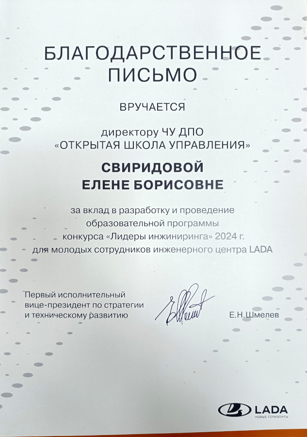• Завершение конкурса "Лидеры инжиниринга 2024". Участие в разработке и проведении образовательной программы конкурса для молодых сотрудников инженерного центра LADA.