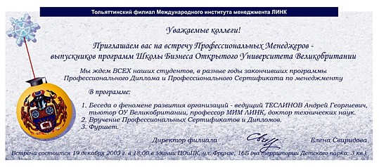 19 декабря 2003 года состоялась встреча Профессиональных Менеджеров - тольяттинских выпускников программ по менеджменту Школы Бизнеса Открытого Университета Великобритании.