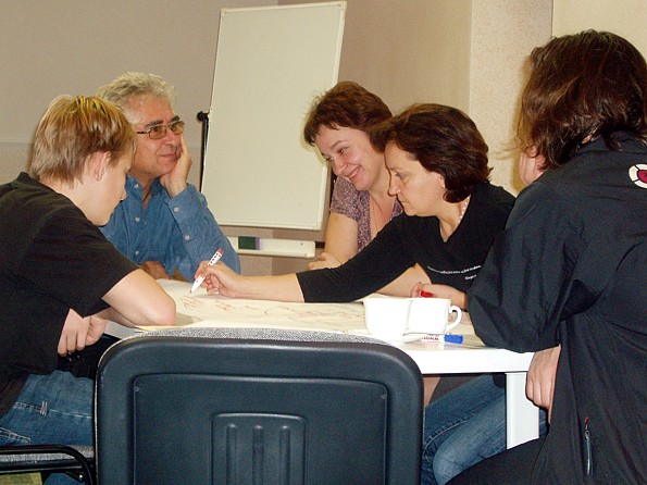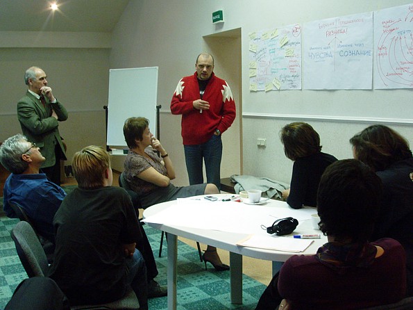 "Говоря о работе каждого из нас в роли преподавателя-тьютора, можно смело говорить об амплуа. Эти амплуа связаны не только с любимыми темами для обсуждения со студентами, но и со стилем, которого мы придерживаемся. Мы затеваем ролевые игры, пишем сценарии, учим монологам-презентациям, диалогам-обсуждениям.