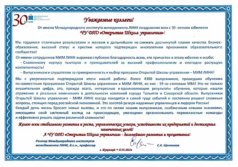 По этому случаю приветственный адрес собравшимся направил ректор МИМ ЛИНК Сергей Александрович Щенников.
