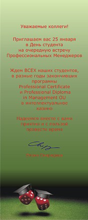 25 января в студенческий праздник "Татьянин день" состоялась традиционная встреча Профессиональных Менеджеров – тольяттинских студентов и выпускников программ OU Business School и Международного института менеджмента ЛИНК. Собрались студенты в разные годы закончившие программы Professional Certificate и Professional Diploma in Management OU Business School, а также слушатели программы МВА ЛИНК "Стратегия".