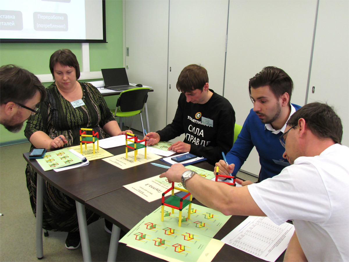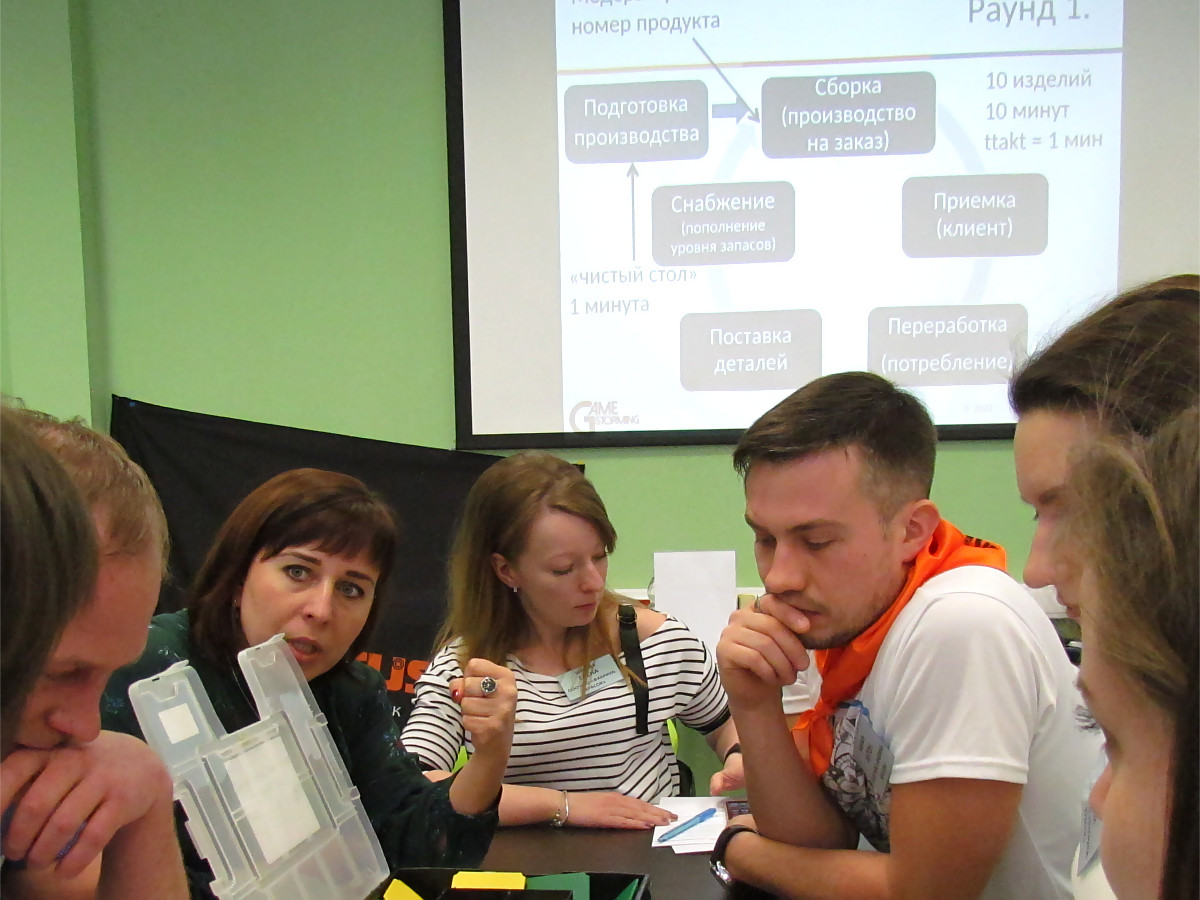 В ходе деловой игры "LEAN-эксперт" каждая команда создавала предприятие, где было планирование, логистика, производственный процесс, контроль качества и отгрузка продукции клиенту. Производственная задача состояла в выполнении заказов на поставку разнообразной продукции "точно вовремя" при минимальном участии кадровых ресурсов. Успешное решение этой задачи подразумевало не только построение эффективного производственного процесса, но и эффективной системы снабжения производства комплектующими, синхронизированной с производством.